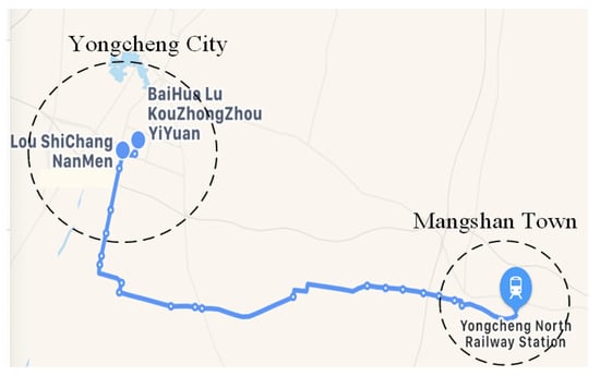 Bus operation route map. (a) Yongcheng City to Mangshan Town downstream route map; (b) Mangshan Town to Yongcheng City upstream route map.