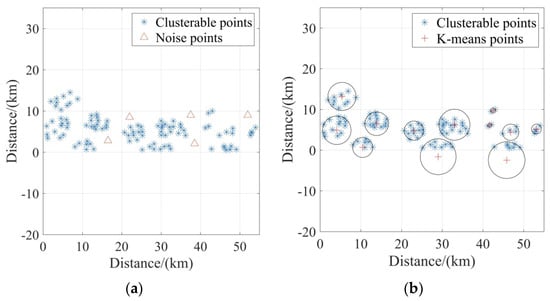 DK−means algorithm clustering results. (a) Clustering diagram of passenger demand points; (b) site optimization diagram.