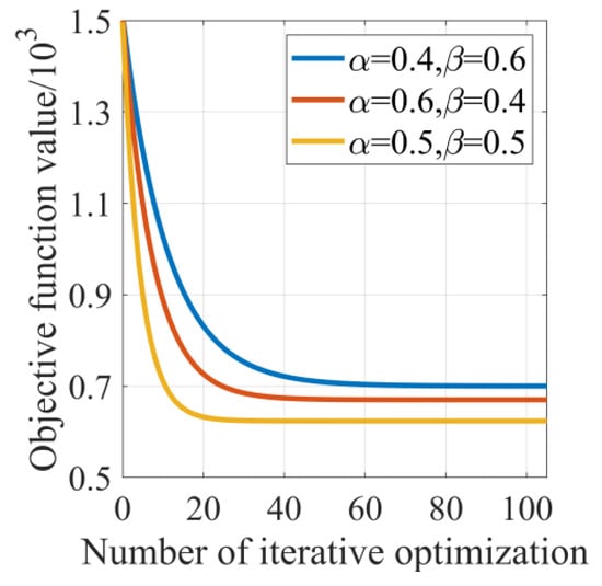 The model was solved in a MATLAB environment using a genetic simulated annealing algorithm, and the results of the operation showed that the objective was optimal when and . An iterative optimization run diagram is shown in Figure 9.