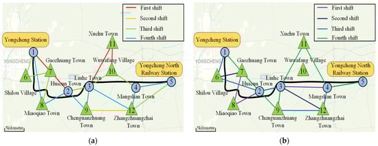 Table 5 and Table 6 are the time for the four shifts to pass through fixed stations (1, 2, 3, 4, 5) and alternative stations (6, 7, 8, 9, 10, 11, 12), where “—” means that the vehicle does not pass the station.
