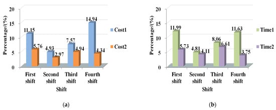 Effects of reduction. (a) Operating costs; (b) running time. (Note: Cost1 and Cost2 indicate the operating cost savings of DK-means variable-route DRT compared to regional flexible DRT and K-means variable-route DRT, respectively; Time1 and Time2 indicate the ride time savings of DK-means variable-route DRT compared to regional flexible DRT and K-means variable-route DRT, respectively).