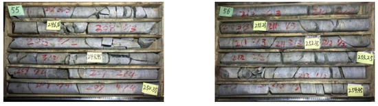 Combined with the on-site core survey (Figure 1), it was determined that the surrounding rock mass of the main shaft within the depth range of −930~−1280 m is free of fragmentation. The structural surface is closed without filling, and the particle boundary on the core surface is in close contact. It was comprehensively judged that the surrounding rock mass of the shaft in this depth range is un-weathered. Combining the scoring method of RMR, the rating of rock mass is shown in Table 1. The UCS was obtained on MTS815 in our laboratory, which is a fully integrated high-force test system optimized for carefully controlled characterization of brittle materials. In total, 200 specimens sampled at different depths were used.