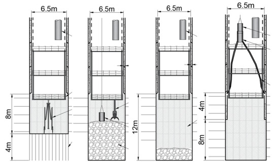 The net diameter of the main shaft is 6.7 m with elevation wellhead at +32.9 m. The elevation of the bottom of the well is −1488.1 m, and the depth of the wellbore is 1527 m. The content of the project mainly includes the excavation of the shaft, the development of horizontal road ports, the arrangement of cables, etc. The construction process is shown in Figure 3.