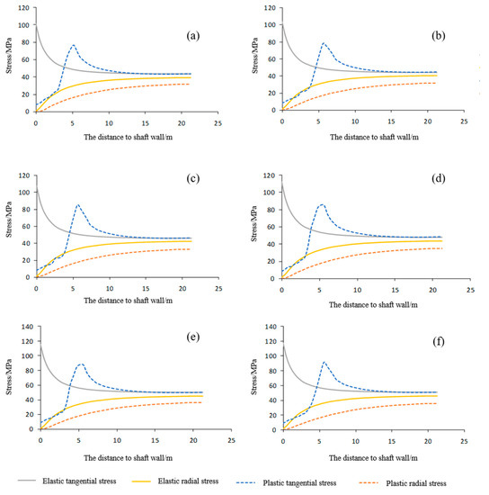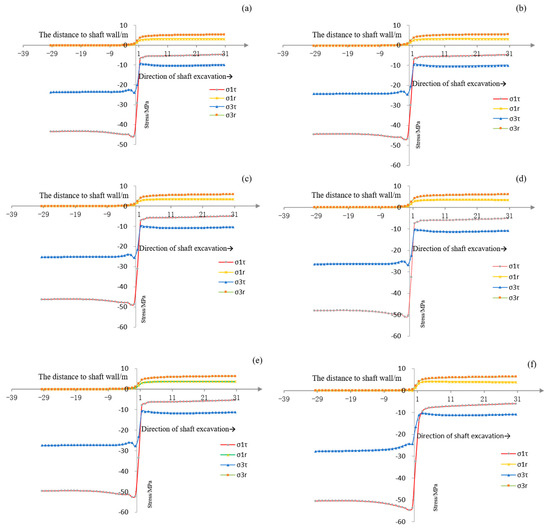 The stress redistribution of the cross-section of the surrounding rock mass of the shaft at different depths: (a) −1050.0~−1073.0 m, (b) −1073.0~−1102.0 m, (c) −1102.0~−1153 m, (d) −1153.0~−1207 m, (e) −1207.0~−1250.0 m, (f) −1250.0~−1271.0 m.