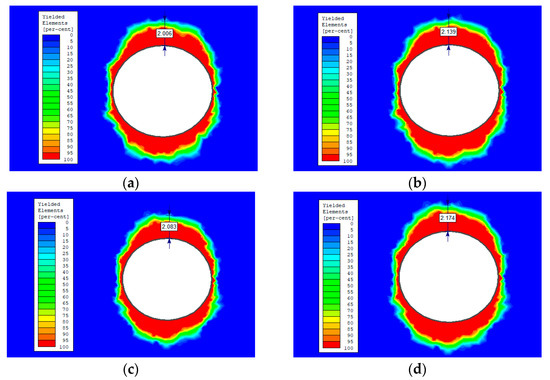 Distribution of plastic zone in surrounding rock mass of shaft at different depths. (a) −1102~−1153 m; (b) −1153~−1207 m; (c) −1207~−1250 m; (d) −1250~−1271 m.