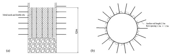 Schematic diagram of the −930~−1500 m support design of the new main shaft: (a) Schematic diagram of longitudinal section. (b) Schematic diagram of transverse section.
