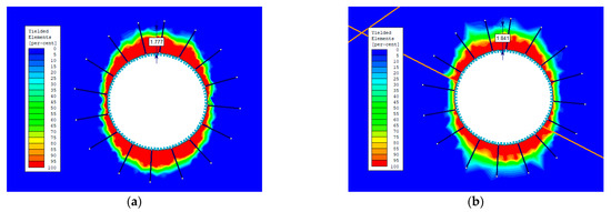 According to the simulation results of bolt support in Figure 8, the length of the bolt is 2.5 m, and the radii of the plastic zone obtained by the simulation are 1.78 m and 1.84 m, respectively, which are smaller than the design length of bolt support and meet the requirements of bolt support for the surrounding rock of the shaft. It is found that the design concept of traditional shallow-buried shaft support—“improving the strength of concrete and increasing the thickness of concrete lining to control the stress”—is not feasible in the design of a deep shaft support.