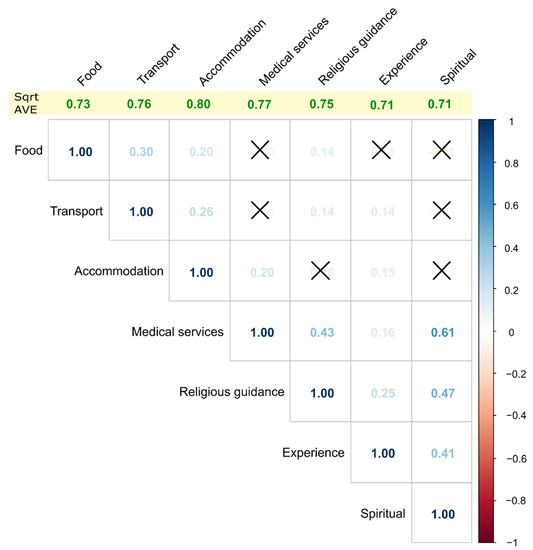 A correlogram depicting a correlation matrix of the coefficients between different constructs. Blue indicates positive correlations, and the color intensity is proportional to the coefficients. Coefficients masked with ‘X’ symbols indicate insignificant correlations. The square roots of the average variance extracted (Sqrt AVE) are highlighted in yellow.
