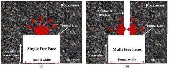 It is well known that the dynamic tensile strength of rock is much lower than the dynamic compressive strength [23,24]. If the tension stress waves exceed the dynamic tensile strength of the rock, cracks will be generated gradually, and this tensile stress leads to greater damage to the rock mass in the vicinity of the free face [16]. Therefore, when a propagated compressive stress wave from the detonated explosive reaches an uncharged hole, it turns into a tensile stress wave; thus, the rock is effectively crushed around the uncharged hole. A tunnel structure generally has only one free face, which is the tunnel face. To effectively blast in tunneling, adding free faces is the most vital factor for initiating or maximizing the Hopkinson effect.