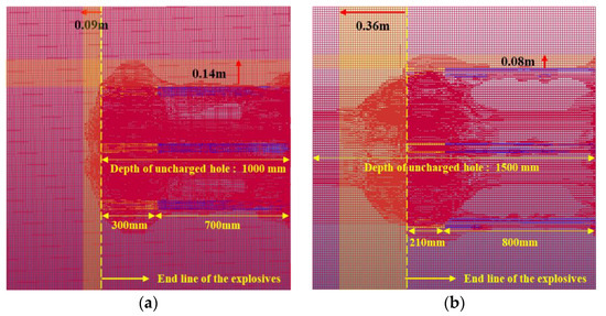 Comparison of failure zones depending on the amount of explosives in the LLB methods. (a) Total explosives length of 300 mm (original LLB method); (b) total explosives length of 210 mm (modified LLB method).