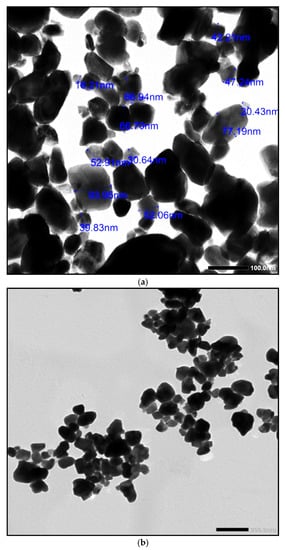 TEM or Transmission Electron Microscope of JEOL model, Japanese-made available at the Faculty of Science, Alexandria University in Egypt was used to photograph WO3 powder nanoparticles before adding it to the marble formation to know its average size as shown in Figure 3a,b. From the TEM imaging, it was confirmed that the size of the used WO3 particles is all less than 100 nm with an average of 40 nm, and on the other hand, the shape of the particles is spherical as shown in the figure.