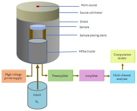 HPGe with a relative efficiency of 24% and energy resolution of 1.92 at 1.333 MeV, and three different radioactive point sources Cs-137, Co-60, and Am-241 were used to experimentally measure the attenuation coefficients of the prepared samples as shown in Figure 4. These radioactive sources were used because they emit photons of different energies, where Am-241 source emits energy in the low range (0.060 MeV), this energy plays an important role in X-ray imaging while Co-60 (emits 1.173 and 1.333 MeV) and Cs-137 (emits 0.622 MeV) play an important role in medical, industrial and agricultural applications as well as food preservation, and therefore, they are dealt with continuously. Therefore, we focused on the energies that come out of them and how to reduce their effect and hazards.