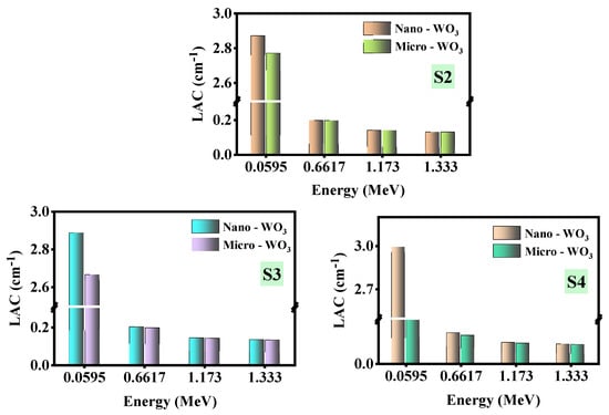 Figure 6 plots the relationship between the LAC of the prepared marble samples with WO3 nano- and microparticles. The aim of this figure is to examine the influence of particle size on the LAC of the shielding materials. For all three samples, the LAC of the samples with WO3 nanoparticles was slightly higher than the LAC of the microparticle WO3. For example, at 0.0595 MeV, for the S2 marble sample, its LAC with micro-WO3 is equal to 2.771 cm−1, while its LAC with nano-WO3 is equal to 2.8715 cm−1. Additionally, S3′s LAC values at 0.662 MeV are equal to 0.195 cm−1 and 0.1998 cm−1 with micro- and nano-WO3, respectively. These results show that reducing the size of the WO3 particle enhances the radiation protection ability of the prepared samples and this is also found in previously published papers on epoxy and concrete [49,50]. The distribution of small particle size (nanoparticle) is better than large particle size (microparticles) because of large distribution surfaces; hence, the absorption rate has been found better, and that is why contamination of nanoparticles on the shielding material enhances the efficiency of the material. The effect of the nano-WO3 concentration on the LAC values is graphed in Figure 7 to determine their relationship. The figure shows that S4 has a higher LAC than S1, and since the S4 sample contains 0.2 WO3 while S1 contains no WO3, the addition of the heavy compound WO3 leads to an increase in the LAC values. Therefore, adding heavy compounds such as WO3 improves the attenuation performance of the prepared waste artificial marbles.