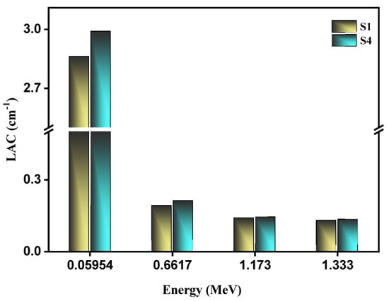 Figure 5 illustrates the experimental and theoretical LAC values (obtained using the Phy-X software) for the S1 sample. By comparing the two results, we aim to validate the experimental setup, as if the values are close together, then the experimental results can be trusted with a high degree of accuracy to properly determine the LAC of the other samples. The figure reveals that the two methods indeed do return values that are very close together. For example, at 0.662 MeV, the experimental LAC for S1 is equal to 0.1911 cm−1, while its theoretical LAC is equal to 0.197 cm−1. Meanwhile, at 1.17 MeV, the experimental and theoretical LAC is equal to 0.1389 cm−1 and 0.140 cm−1, respectively. From these results, we can adequately use the experimental results to assess the shielding ability of the samples S2–S4.