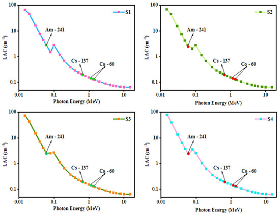 Figure 8 plots the LAC of the four artificial marbles with WO3 at a wide energy range. Since only a limited number of radioisotopes are available at our lab, the energy values that we can analyze are also limited. In order to obtain a wider range of LAC values, at both low and high energies, the LAC of the samples with micro-WO3 was plotted between 0.015 and 15 MeV. The experimental results were obtained using three radioisotopes included in the same figure. All four of the investigated samples have their greatest LAC values at 0.015 MeV, decreasing as the energy increases. For example, S2’s LAC at 0.015 MeV is equal to 68.885 cm−1, and then drops to 15.390 cm−1 at 0.03 MeV, 2.771 cm−1 at 0.0595 MeV, and 1.144 cm−1 at 0.150 MeV. The LAC value continues decreasing at all energies, but a small peak occurs at 0.1 MeV, which is due to the K-absorption edge of Pb (the samples contain PbCO3). At higher energies, the LAC of the samples is very high, and the difference between the LAC of the samples also gets much smaller. For instance, the LAC of the samples at 1.33 MeV are all roughly equal to 1.30 cm−1 ± 0.01 cm, while at 15 MeV they are equal to 0.064 cm−1 ± 0.01 cm. This trend can be explained by the Compton scattering interaction, which has low dependence on the atomic number of the materials.