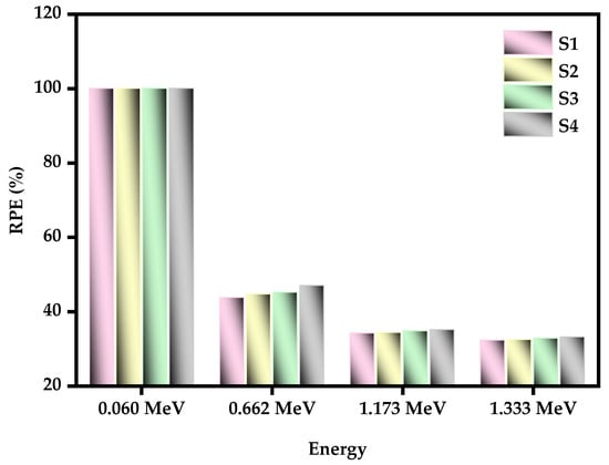 The Radiation Protection Efficiency (RPE) measures the ability of the material to absorb the incident photons and was calculated according to the following equation [47,48].