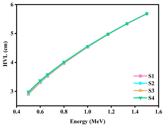 The half-value layer (HVL) of the samples was calculated and graphed in Figure 10. At 0.0595 MeV, the HVL values are at their minimum, which means that a thickness of about 0.23 cm is enough to absorb 50% of the incoming photons at 0.0595 MeV. As the energy of the incoming radiation increases, so does the penetrating power of the photons. Thus, a shield with a thickness of about 3 cm is needed to shield 50% of photons with an energy of 0.662 MeV. From these results, it is clear that the HVL values are highly dependent on the energy, as HVL drastically changes from 0.2 to 3 cm as the energy increases from 0.0595 to 0.662 MeV. Continuing, the thickness of the marbles reaches around 5 cm when the energy increases to 1.33 MeV. More specifically, to shield 50% of incoming radiation with an energy of 1.33 MeV, a 5.35 cm thick sample of S1 is needed, or a 5.19 cm thick sample of S4 is needed.