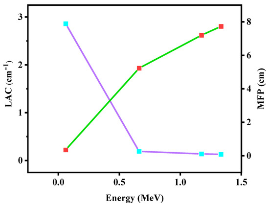 Figure 11 shows the relationship between the LAC and MFP of S4. The figure demonstrates an inverse relationship between LAC and MFP, meaning that MFP increases as the energy increases from 0.0595 to 1.33 MeV, while LAC decreases as energy increases. As an illustration, it can be shown that the smallest MFP value occurs at 0.0595 MeV is equal to 0.334 cm (for S4), but quickly decreases to 4.73 cm at 0.662 MeV. While at energy 0.0595 MeV, the value of LAC is 2.86 cm−1 (for S4) and a sharp decline has been found at energy 0.662 MeV with the value of LAC (0.191 cm−1).