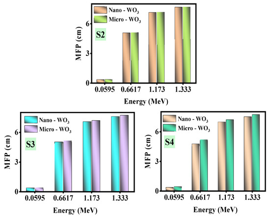 The MFP for the waste artificial marble samples with nano- and micro-WO3 are graphed in Figure 12. to determine the effect of particle size on the MFP values. By observing S2’s results, it can be seen that the MFP for nanoparticle-WO3 is lower than the MFP for S2 with micro-WO3. Thus, using nanoparticle WO3 is preferable for radiation shielding applications since a lower thickness is required to obtain the same attenuation capability, which improves space efficiency in comparison with micro WO3. The same results can be concluded for S3 and S4; namely, the MFP of the nanoparticle samples was lower than the microparticle counterparts.