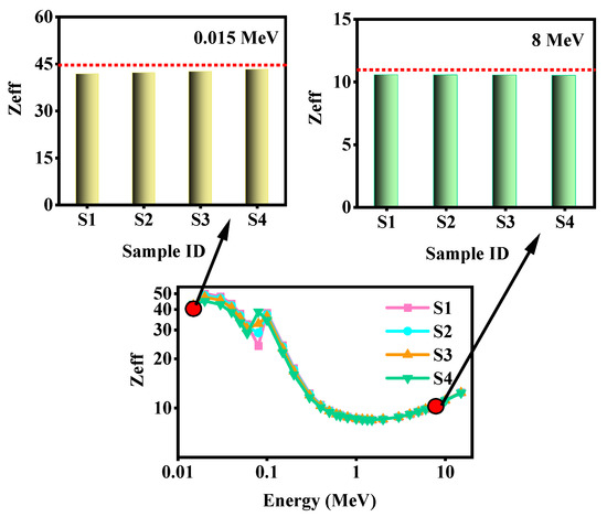 In Figure 13, the Zeff for the samples with micro-WO3 were graphed against energy. The Zeff values can be divided into three regions: before 0.1 MeV, between 0.1 and 0.8 MeV, and after 0.8 MeV. In the first region, the Zeff is very high. As can be seen by the subfigure highlighting the results at 0.015 MeV, the values are around 42. In the second energy region, Zeff greatly decreases and approaches its minimum value. Lastly, in the third energy region, the Zeff values are almost constant up to 8 MeV, after which they slightly increase. At 8 MeV, the Zeff values are small and are around 10. The comparison table on the performance efficiency of the reported literature has been added to confirm the advantage of the prepared materials, shown in Table 3.