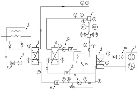 Schematic of the testing stand: 1—tested two-phase ejector; 2—evaporator; 3—preheater/vapour generator; 4—condenser; 5, 6, 7—mass flow meters; 8, 13—electric heaters; 9, 10, 11, 12—circulation pumps; and 14—dry cooler.