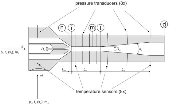 The numerical model presented here deals with the mathematical description of the processes occurring in the two-phase ejector. The schematic diagram of the two-phase ejector with its description of the essential cross-sections used in the model is shown in Figure 2. The following assumptions were made: