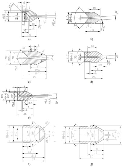Geometries of the tested motive nozzles of the ejector; see Table 1.