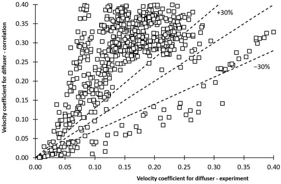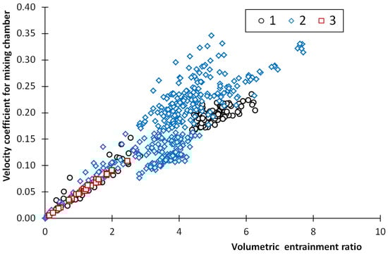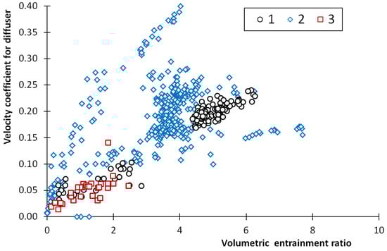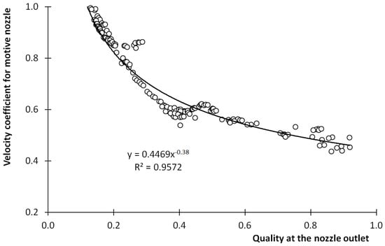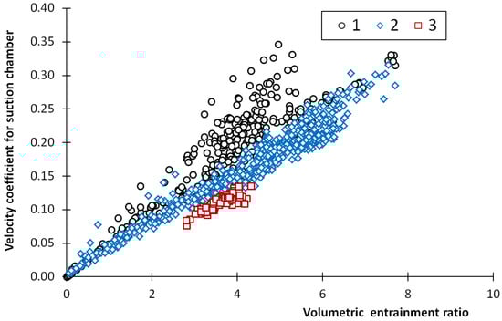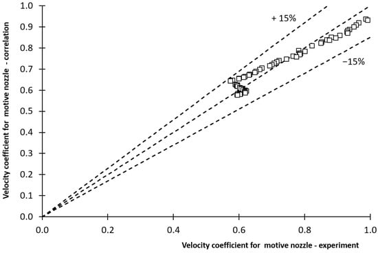 - Based on the experimental results of the ejector with various geometry described by the geometrical parameters Λ and Ψ, the correlations of the velocity coefficients of the components of the ejector were proposed. The quality of fluid x in the case of the motive nozzle and the volumetric entrainment ratio χ for other ejector components were selected as the parameters that affect, to the maximum extent, the experimentally obtained velocity coefficients. For the components of the ejector, the velocity of the coefficients lower than 0.4 was obtained for the tested ejector and operation conditions. Except for the motive nozzle, the linear proportional relationship between the velocity coefficient and entrainment ratio was found. The numerical results based on the proposed correlations fit with the experimental data within 30%.