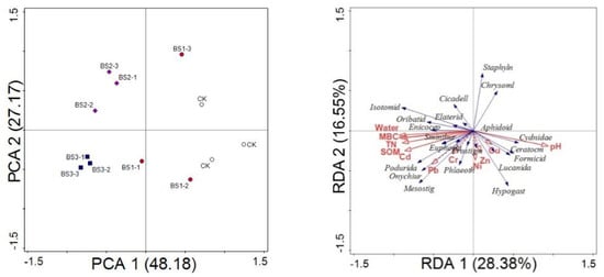 Principal component analysis ordination diagram for soil arthropod groups under different amounts of applied biosolids (Left). CK, without biosolids. BS1, BS2, and BS3: Biosolids applied at a rate of 15, 30, and 45 ton ha−1 per season, respectively. Redundancy analysis of the arthropod groups with soil properties and total heavy metal concentrations (Right). SOM, soil organic matter; TN, total nitrogen; MBC, microbial biomass carbon. Dashed lines indicate non-significance.