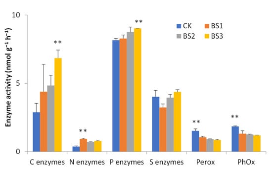 Soil enzyme activity under five-year biosolid application. CK, without biosolids. BS1, BS2, and BS3 refer to biosolids inputs of 15, 30, and 45 ton ha−1 per season. The double asterisks above the columns indicate significant differences between treatments (Fisher’s LSD test).