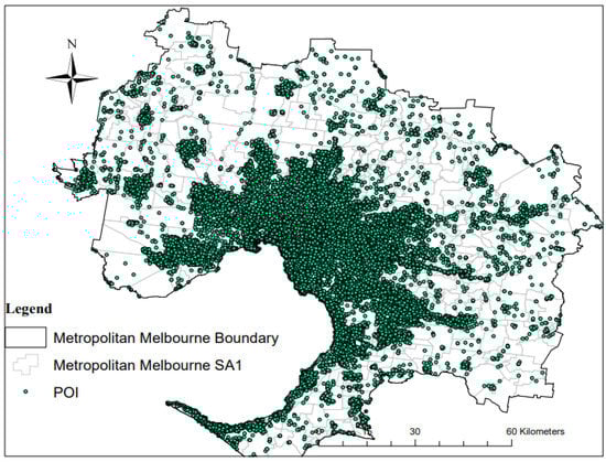 Distribution of POIs within metropolitan Melbourne SA1s (https://desktop.arcgis.com/en/arcmap/latest (accessed on 12 October 2022) [77].