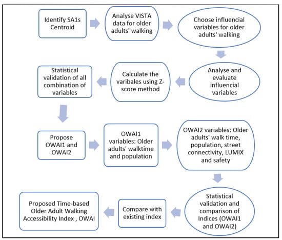 From Figure 2, to develop the indices, this study identifies the centroid of each SA1s (total of 10,289) within metropolitan Melbourne. Using the household survey datasets (VISTA datasets) total number of older people walking, including the population, residence area information, and walking destinations, are analyzed. Afterward, the influential variables, including walk time, LUMIX, population, safety, and street connectivity datasets, are collected from various sources, and analyzed using the Z-score method. The statistical Z-score calculation method is used for all variables, including older adults’ walk time, older adult population, land-mix use for four destination types, street connectivity and older adults’ pedestrian safety. Z-score (also called the standard score) is a numerical measurement that describes a value’s relationship to the mean of a group of values. The z-score value indicates the difference between standard deviations and the mean. If a z-score is equal to 0, it is on the mean. A positive z-score indicates that the raw score is higher than the mean average. Similarly, a negative z-score reveals that the raw score is below the mean average [69,70,71,72]. In this paper, the variables are calculated for all 10,289 SA1s. All the variables were analyzed with a different combination of index structures. Each of these variable combination index structures was checked using statistical test methods. Among those indices, OWAI1 and OWAI2 are statistically significant with the best results. Finally, the proposed time-based older adult walking accessibility index is compared with existing WI.