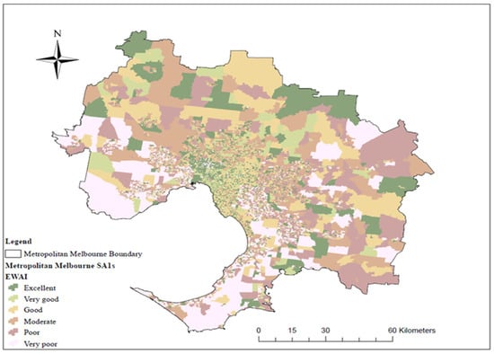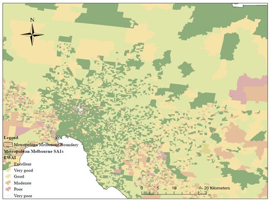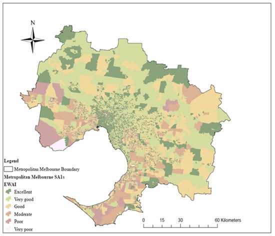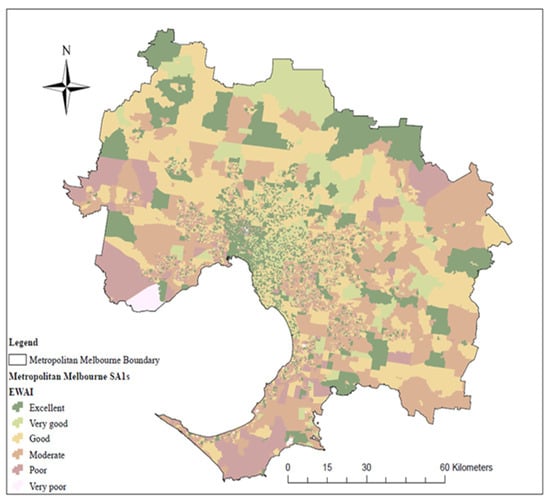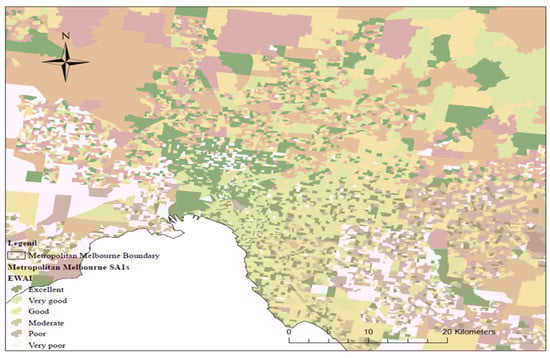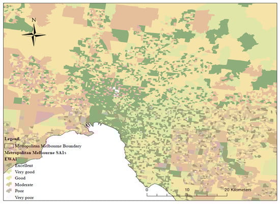 Distribution of walking access levels in different SA1s in metropolitan Melbourne using OWAI1 (Geometrical Interval method, https://desktop.arcgis.com/en/arcmap/latest (accessed on 12 October 2022) [77]).