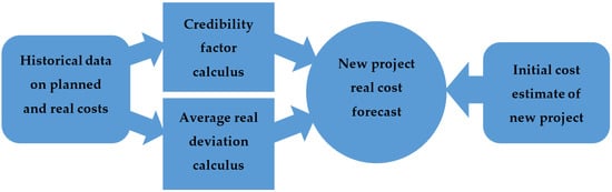 To sum up, following Equation (1), the proposed methodology consists in adjusting initial cost estimates by a risk factor. The latter is estimated using historical data on accomplished projects that compares the initial cost estimates with real project costs. In this sense, our approach should be considered as fairly simple both to understand and to apply. Furthermore, data requirements are not demanding at all—a database with information on expected and real costs of past projects that belong to a given investment category (e.g., roads) would be sufficient. The main steps required to provide the AC forecast for new construction project are shown on Figure 1 below.