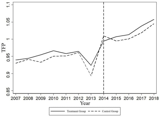 The DID method assumes that the treatment and control groups have a parallel trend before the event. As shown in Figure 1, the TFP trend of the treatment and control groups is similar before the official BRI launch in 2014.