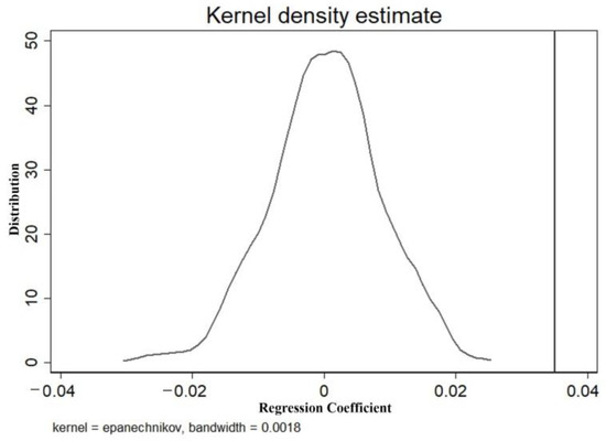 The process is repeated 1000 times to ensure that the placebo test effectively identifies causality. Figure 2 shows the probability density distribution diagram of the estimated coefficient of the BRI policy variables. Accordingly, the estimated values of the randomly generated policy variables are densely distributed around zero. Thus, γ = 0 can be deduced to verify whether no unobservable random disturbance term affects the causal conclusion—the randomly generated BRI policy variables have no impact on the TFP of key provinces. Therefore, the positive and significant BRI impact on the TFP development in key provinces is not affected by unobserved random disturbances.
