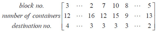 Finally, an assignment plan is illustrated by a three-row matrix, as illustrated in Figure 3, in which the first row refers to the block number, the second row refers to quantities of containers assigned to the block and the third row refers to the destination port of the assigned containers. Moreover, the column number of the matrix represents the loading order of blocks.