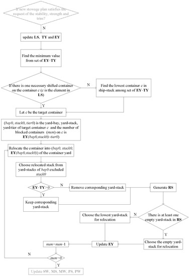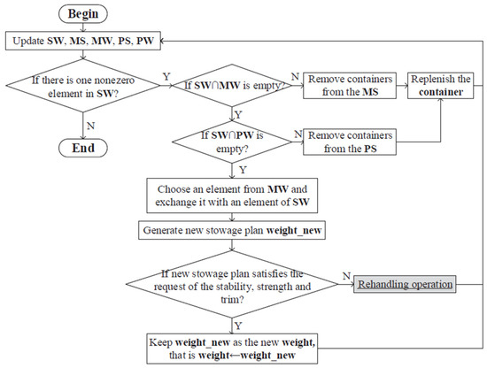 The basic idea of the HAD is to firstly load containers with the corresponding weight and destination port to the ship slots from the yard stack’s top tier. If there is no container with the corresponding weight and destination port in the yard stack’s top tier, an adjustment is made to the original stowage plan for the weight distribution, to accomplish the loading operation without relocations in the yard. If the seaworthy requirements of the adjusted stowage plan conflict with the design value, the original stowage plan remains and rehandling operations are generated in the yard. Figure 6 describes the flow chart of the HAD.