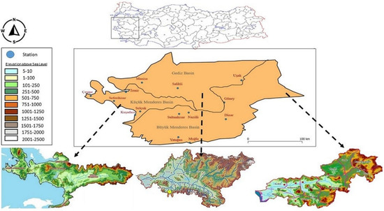 The Aegean Region, with a surface area of 85,000 km2, is Turkey’s third smallest and the most populated region simultaneously. It is adjacent to the Marmara Region in the north, the Mediterranean Region in the southeast, the Central Anatolia Region in the east, and the Aegean Sea in the west (Figure 1). The Mediterranean Climatic, with its dry and, hot summers and wet and mild winters, is the predominant climate type in the region. The dominance of the Mediterranean climate, however, is more sensible in the coastal areas. Yet, due to the local terrain and the land cover, maquis, the Mediterranean climate can be observed in the inner parts of the region as well. There are some forests and jungle zones mostly covered by maquis up to 400 m above sea level. However, the urban area is located mostly on the edges of the fertile plains, while the rural settlements are generally located on the stream banks and valleys. By considering this, since the Roman times, the planning and protection of the water resources and its infrastructures considered as a vital task. Hence, in the following, the situation of the precipitation and temperature in the Aegean Turkey is addressed using a set of data acquired from three major watersheds that will be detailed afterward.