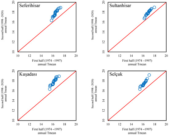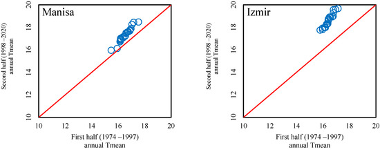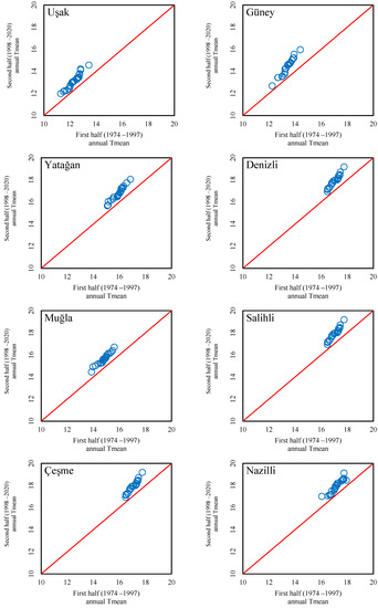 Average annual temperature trends were calculated using Spearman’s rho test, Mann-Kendall test, Thiel-Sen, and Pettitt’s test. MK, TS, and SR are used to find trends in temperature time series, while PT is used to determine turning points in time series. In this respect, Table 3 shows an increasing trend at 14 meteorological stations (Δ at all stations). Then, the TS approximation is applied to find the magnitude of the slope. It has been determined that the annual average temperature increases by about 0.20 to 0.35 °C every ten years. Sudden changes in annual mean temperature are determined by PT at all stations (Table 3). The years in which sudden changes were detected can be listed as 2007 in Usak, 2015 in Izmir, 2007 in Guney, 2016 in Manisa, 2013 in Nazilli, 2012 in Salihli, 2007 in Cesme, 2016 in Yatagan, 2007 in Mugla, and 2014 in Usak, Denizli, Selcuk, Sultanhisar, Seferihisar, and Kusadasi stations. The TS trend test is used to investigate the presence of trends in temperature data. Results increased at all stations (for all 14 stations) (Figure 2). Therefore, in the future, the temperature is expected to keep the same trend and increase at the same rate. Therefore, as the global mean of the temperature increases, the frequency and magnitude of the climate extremes would alter the nature of the hydro-climatology and macro-climate patterns.
