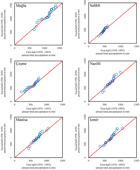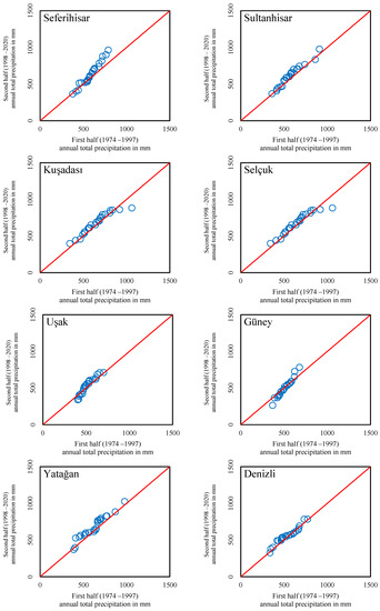 As a result of MK analysis for annual precipitation time series, it was determined that there was no significant trend in precipitation at Manisa, Salihli, Mugla, Denizli, Yatagan, and Usak stations, and thus the SR test result was also confirmed. Using the TS method, it was determined that the annual increase in precipitation at Izmir, Nazilli, Cesme, Guney, Selcuk, Sultanhisar, Seferihisar, and Kusadasi stations was increasing () as given in Table 4. Table 4 also shows that sudden changes in precipitation regimes were common in all stations in 1998. TS values also showed similar results when the MK test given in Figure 3 is taken into consideration.