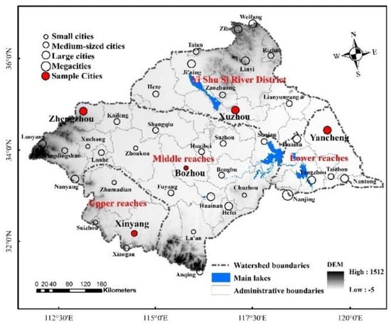 In order to reflect the urban expansion characteristics of the Huaihe River Basin, the selection of sample cities is crucial. This study first considered the different scale levels of the cities, but the megacity Nanjing, which is the main body of urban construction, is not within the study area []. Therefore, three scale cities of large-, small-, and medium-size were selected for the sample. Due to the different size distribution of cities in different watershed locations, most of the cities in the upper reaches are small- and medium-sized cities, while most of the cities in the middle and lower reaches as well as in the Yishushi River region are large- and medium-sized cities. Therefore, considering the location of the city’s watershed, the functional characteristics of cities (Table 1), and the conclusion of previous studies that large cities are more suitable for urban land density models [], five sample cities were finally identified: Zhengzhou, Xuzhou, Yancheng, Xinyang, and Bozhou.