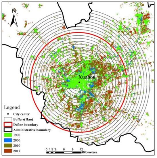 We divided each city into a series of 1 km concentric rings using the central business district (CBD) and the geometric center of the impervious surface as the center of the ring, and selected an edge ring, which is able to accommodate a continuous functional urban area and excludes small cities far from the urban core, as the city boundary []. Taking the CBD in 1990 as the center, we created 1 km buffers in an increasing, stepwise manner (Figure 2). Each city was partitioned into a series of 1 km rings extending outward from the center.
