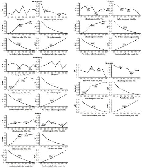 In order to identify the inflection points in the landscape index changes in decades with spatial granularity, the means of six landscape indices in Zhengzhou, Xuzhou, Yancheng, Xinyang, and Bozhou were calculated (Figure 3). The three landscape indices of the total class area (CA), largest patch index (LPI), and perimeter-area fractal dimension (PAF-RAC) show obvious inflection points or irregular characteristics. Among them, the CA index of Zhengzhou presents irregular characteristics with the change of granularity, and the corresponding CA indices of Xuzhou, Yancheng, Xinyang, and Bozhou all show two obvious inflection points, which are 50/70 m, 60/90 m, 60/80 m, and 50/80 m, respectively. There is no regularity in the LPI index of Yancheng, Bozhou has three inflection points (40/60/90 m), and the other cities have two obvious inflection points. With the increase of granularity, the PAF-RAC indices of the five cities show a general trend of rising rapidly at first and then rising slowly, with two obvious inflection points, whereas the inflection points corresponding to the mean patch size (MPS), landscape shape index (LSI), and patch density (PD) are not obvious or show no inflection points. Two of them, the LSI and MPS indices, show a downward and an upward trend as a whole, respectively, with the change of granularity, presenting an insignificant inflection point, but concentrated at 60 m. The PD index shows an overall decreasing trend, and Xuzhou has an unobvious inflection point at 60 m, while other cities have no inflection point. The PAF-RAC and MPS indices show an increasing trend, and the degree of disturbance caused by human activity on the landscape pattern increases. The LSI and PD indices continue to decrease, and the fragmentation of the landscape gradually decreases. By contrast, the CA and LPI indices change irregularly, which indirectly reflects the uncertainty in disturbances caused by human activity.