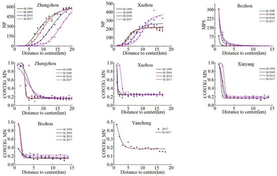 Based on the optimal granularity in Zhengzhou, Xuzhou, Yancheng, Xinyang, and Bozhou, landscape indices such as the patch number, mean contiguity index (CONTIG_MN), and mean patch size were used to analyze the urban landscape characteristics of concentric rings (see Table A1). According to the distribution trend of the scatter plot of landscape indices with distance, the software Origin 2021 was used to select the optimal function to fit (Figure 5 and Table 5). The number of patches and the buffer distance from the city center were fitted to the sigmoid function, and only Zhengzhou and Xuzhou have higher fitting accuracy, reaching over 97%. From 1990 to 2017, for Zhengzhou and Xuzhou, where the buffer distance is within 9 km, the number of patches at the same rings decreased, which indicates that while the city continues to expand outward, the interior of the city becomes more compact. Moreover, the patch index of Xuzhou has intersections between the function curves of different years, with the corresponding patch numbers being 200 and 210. As the distance from the city center to the outskirts increases, the mean contiguity index of Zhengzhou, Xuzhou, Xinyang, Bozhou, and Yancheng showed a downward trend as a whole and stabilized at 0.17, 0.25, 0.2, 0.2, and 0.15, respectively, with similar trends to the distribution of the inverse S-shaped function (Equation (3)), After fitting with this function, the accuracy reaches more than 63%; the mean contiguity index was well fitted with the inverse S-shaped function with an accuracy of over 99% in Xinyang. The mean contiguity index is fitted to the power functions in Bozhou and shows a generally decreasing trend and converged to 0. However, the number of patches and the mean patch size in Yancheng are not fitted with the S-shaped and power functions.