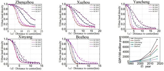 Scatter plots and fitted curves in each city are shown in Figure 6. From 1990 to 2017, urban land density increased, and the urban form became more compact. Zhengzhou is the most compact city. The interval between the fitting curves of urban land density reflects the urban expansion rate. The intervals between the land density curves of the five cities from 2010 to 2017 are much larger than those from 1990 to 2000. The rapid economic growth in the later period led to the rapid urban expansion (Figure 6f). Zhengzhou, Xuzhou, and Yancheng expanded rapidly, Xinyang and Bozhou expanded relatively slowly, and Xinyang was generally unchanged from 1990 to 2000.
