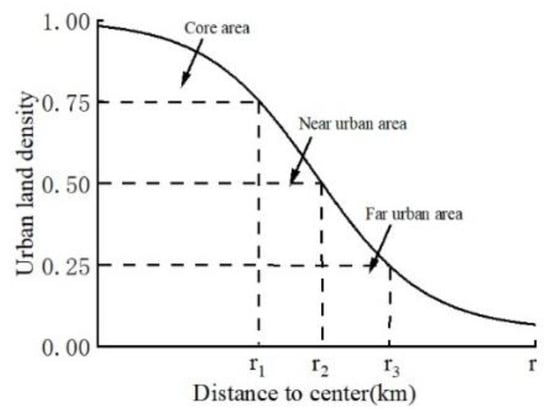 where f(r) represents the urban land density; r represents the distance from the city center; e is Euler’s number; and α, c, and D are the estimated parameters of the model.