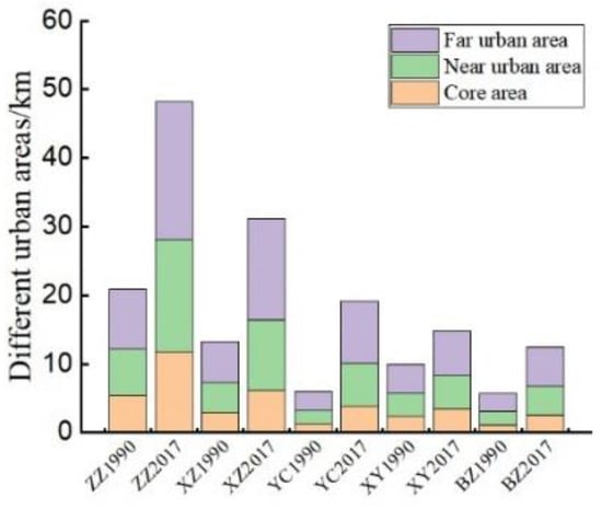 The three large cities of Zhengzhou, Xuzhou, and Yancheng, and the two small- and medium-sized cities of Xinyang and Bozhou, have similar urban land density curves (Figure 6). According to the interval between the curves, the expansion rate of large cities is higher than that of small- and medium-sized cities. By analyzing the node radii of the core, near urban, and far urban areas defined by urban land density, the growth rate of the urban area node radius corresponding to large cities is significantly higher than that of small- and medium-sized cities (Figure 7 and Figure 8).