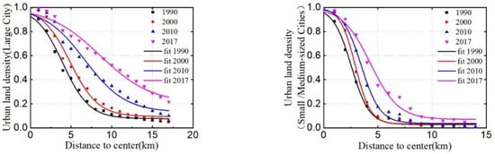 There are obvious differences in the urban land density functions between large cities and small- and medium-sized cities []. The urban land densities of different cities were obtained by averaging the densities of large cities with similar urban land density curves, as well as that of small- and medium-sized cities with similar buffer zones (Figure 9). From 1990 to 2017, the land densities of cities of different sizes gradually increased, but the urban expansion rate slowed from 1990 to 2000, which differs from the standard inverse S-shaped function. Compared with small- and medium-sized cities, large cities expand more rapidly and their land use density tends to approach the standard inverse S-shape, while the urban land density of medium- and small-sized cities tends to decline linearly until reaching a stable value. This finding is consistent with the results of Haikai et al. [], who studied urban expansion along the Belt and Road.