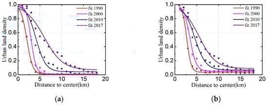 Urban land density functions of Yancheng in different datasets at optimal granularity by distance to the city center. (a) Dataset 1978–2017; (b) Dataset 1990–2019.